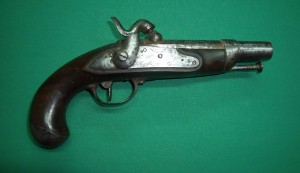 Pistolet de voyage, par Bocheron Pirmet à Paris, à 2 coups, canons Damas superposés, à balles forcées, calibre 11m/m, détentes rétractables, finition extérieure parfaite, fines gravures, crosse en ébène avec réserve de capsules au couvercle en argent décoré d’un angelot. Parfait état. 8eme catégorie.