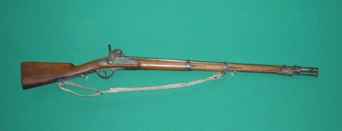 Mousqueton 1822 T Bis, pour l’artillerie et le train d’afrique,( voir Fusils et Carabines de Collection, ref N° 76), Manufacture Royale de Mutzig, année 1834, tout au même N° 171, avec canon de 81cm, 3 garnitures fer, battant de bretelle arrière passé sur la crosse, dans son jus, crosse avec des marquages excellents ( Mars 1834, MUTZIG, et CHATELLERAULT), oxydation en bout de canon, avec sa baguette et sa bretelle d’origine en buffle blanc, légèrement « grignotée » par les souris !! Un exemplaire est au musée de l’Empéri, à Salon de Provence. Modèle peu courant, en très bon état. 8eme catégorie. Réf. : 2-1-016 Cette arme est vendue |