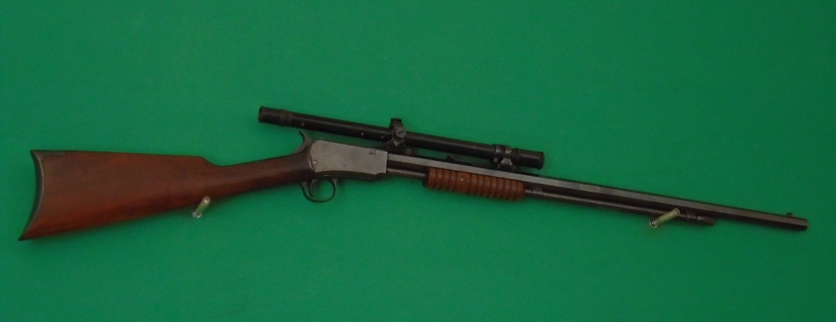 Rifle WINCHESTER modèle 1890, du 3e type take-down, calibre 22LR (rechambré depuis le calibre 22WRF à l’origine: le W.R.F. est barré et remplacé par L.R.), canon octogonal de 24″ (61cm), intérieur miroir, bronzage d’origine à 95%, un peu fané sur l’arrière du boitier, marquages sur le pan supérieur latéral-gauche du canon et sur la queue de culasse du 3e type excellents, avec sa hausse et son guidon d’origine, et équipé d’une rare lunette avec montage d’époque de marque Winchester (marquages excellents), grossissement 2 3/4, très claire, réticule en croix « fils d’araignée », longueur 14″1/2 (37cm), crosse et pompe en noyer vernis d’origine. Excellent état. Catégorie collection D2°e, achat et détention libres. Réf. : 2-6-168 Cette arme est vendue |