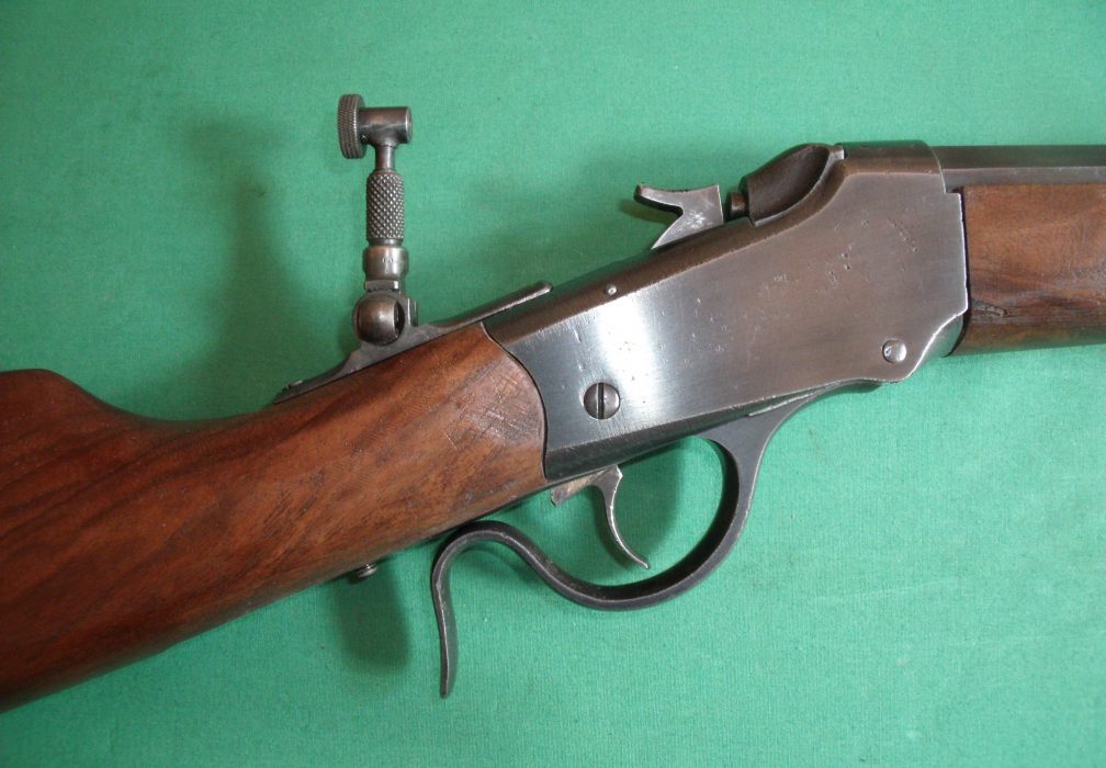 Carabine WINCHESTER Single Shot Target Rifle, Mid Range, Modèle 1885 (fabrication 1893), boitier Low Wall, calibre 32-40WCF, canon octogonal N°2 (bien marqué sur la face inférieure du canon juste devant la longuesse) de 27″1/2 (70cm) intérieur miroir, équipé d’un tang sight Lyman et d’un globe front sight, marquages sur le dessus du canon et sur la sous-garde excellents, finition rebronzage ancien, avec quelques légères piqures sur les faces du boitier et sur le dessus de la culasse, fonctionnement parfait, crosse et longuesse en noyer bien veiné, reponcés et revernis, avec plaque de couche spéciale de la taille de celle des modèles 1876, trappe pour baguette de nettoyage. Excellent état. Catégorie collection D2°,e, achat et détention libres. Réf. : 2-6-190 Cette arme est vendue |